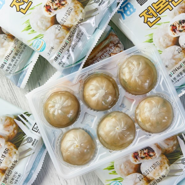 | 포장단위별 용량(중량) | 전복만두 (트레이) 6알 168g,전복(잎새)만두 40알 1kg |