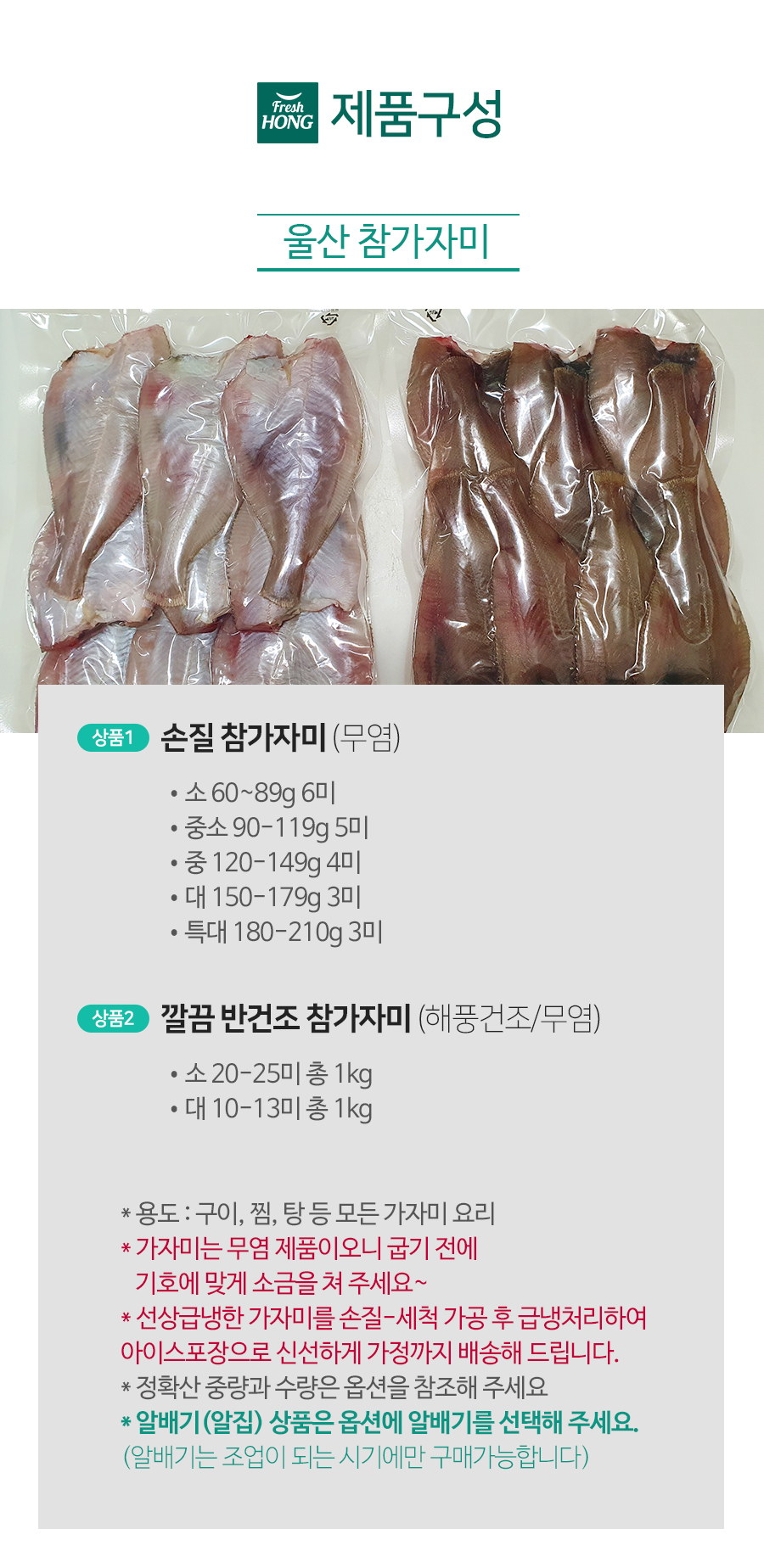 | 포장단위별 용량(중량) | 가자미 중소 90-119g 5미 가자미 중 120-149g 4미 가자미 대 150-179g 3미 가자미 특대 180-210g 2미 |