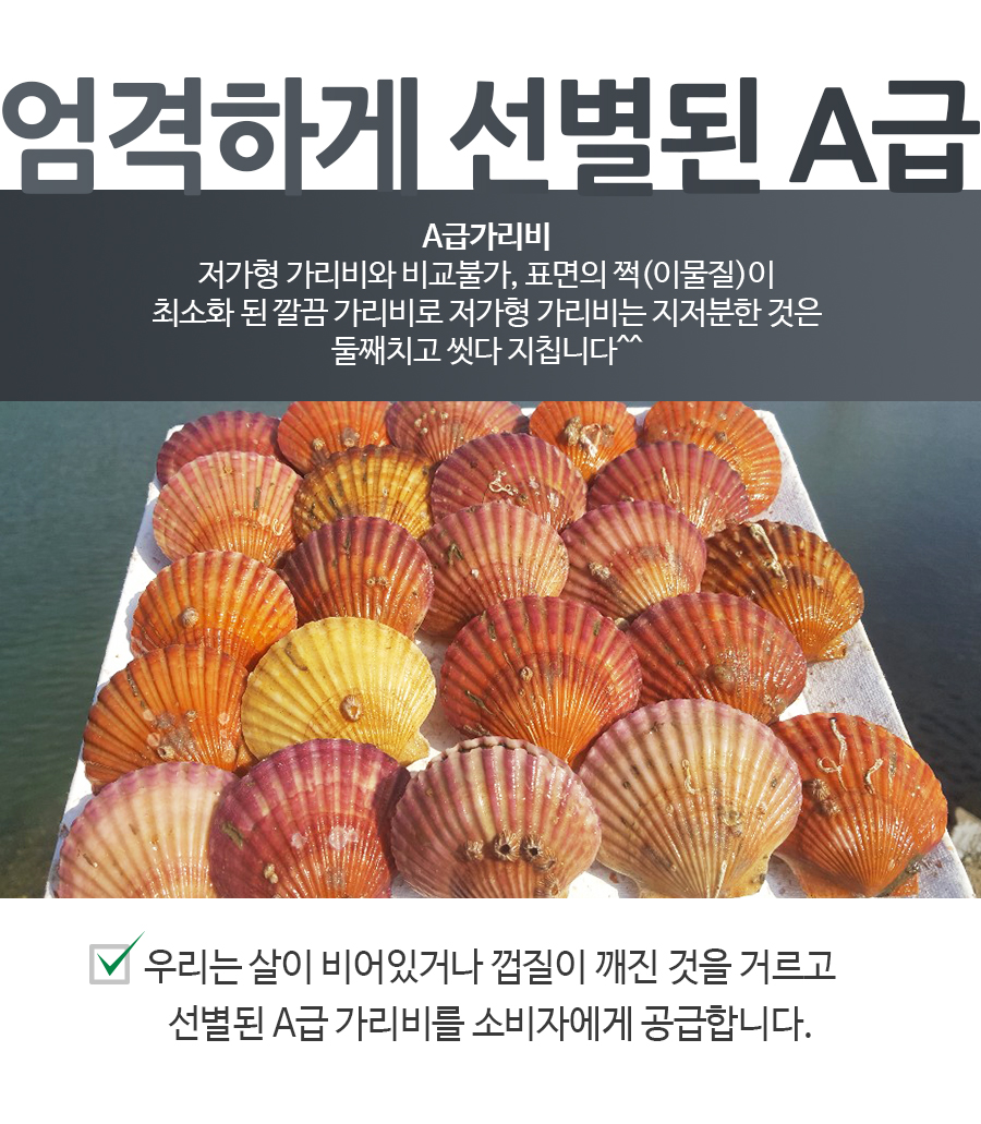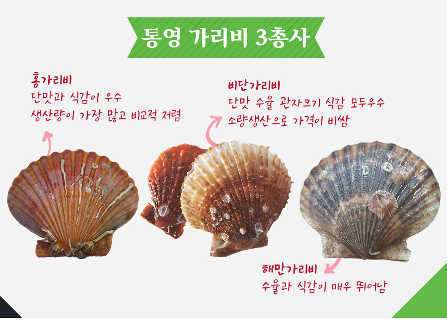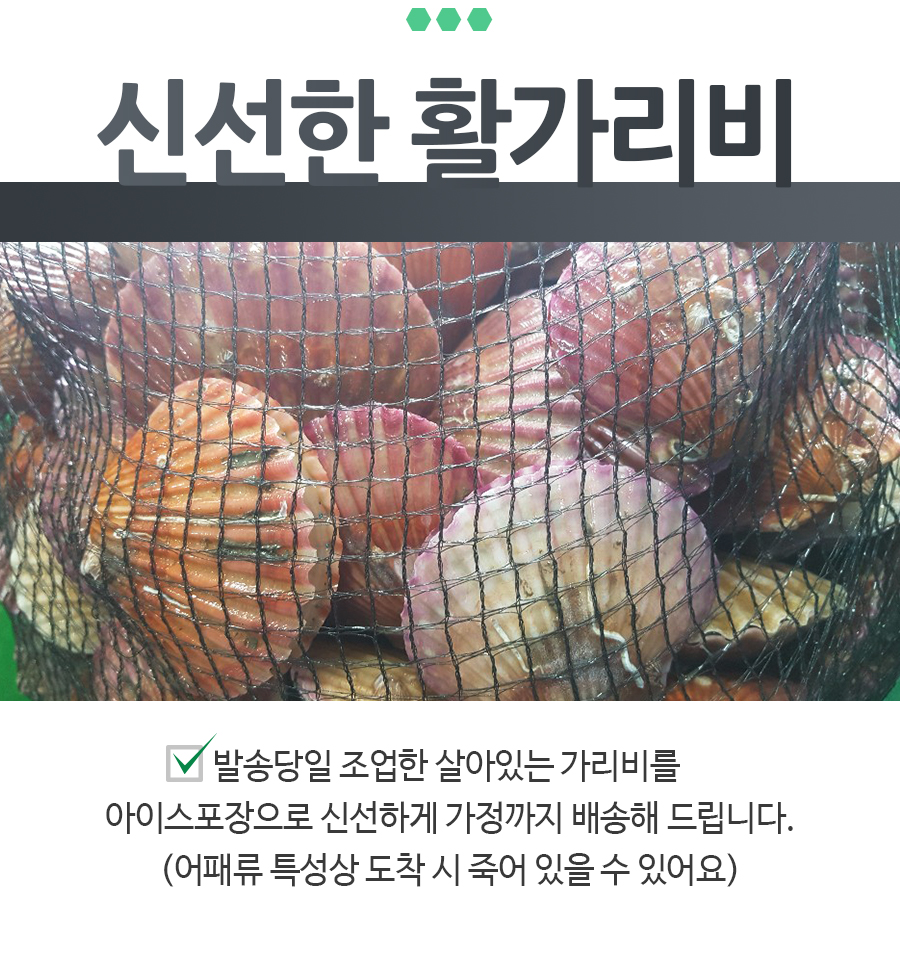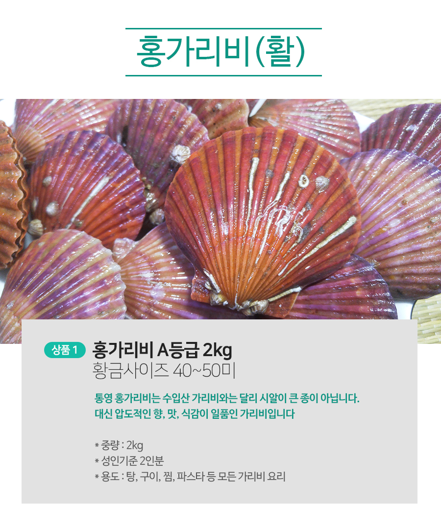 | 상품구성 | 홍가리비 2kg 50미 내,외 비단가리비 1kg 20미 내외, 해만가리비 2kg 40미 내외 |
