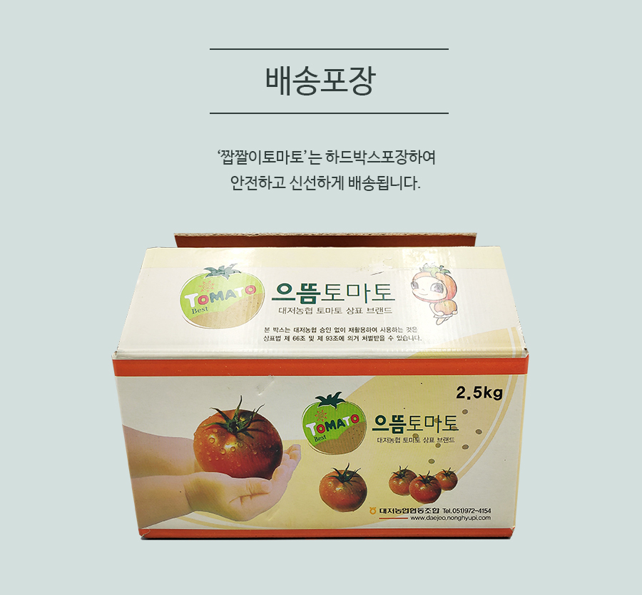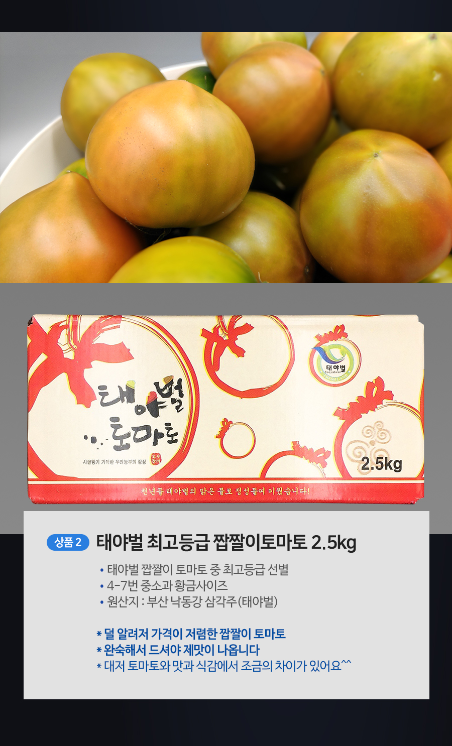 | 포장단위별 용량(중량) | 태야벌 최상급 짭짤이토마토 4~7번과 2.5kg, 대저 프리미엄 짭짤이토마토 4~7번과 2.5kg |